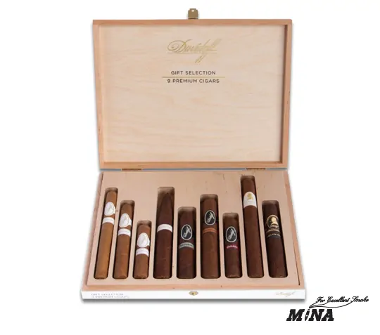 Výběr 9 doutníků Davidoff různých sérií různých velikostí jsou elegantně vloženy v lusuxní dřevěné dárkové krabičce a ta v papírovém obalu.
